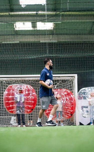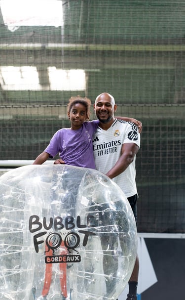 Grand passionné de foot et ultra pédagogue, il sait embarquer petits et grands dans l’aventure Bubble Foot avec un mélange de calme, d’humour et d'énergie maîtrisée.